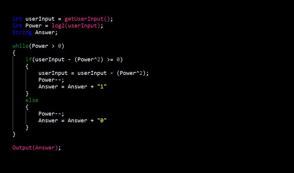 The procedure begins like the octal to decimal converter with getting the users input and as always when converting to decimal it is stored in a character array. Now if the input is more than one (1) character long, we take the first character and convert it to decimal (e.g. 3 equals 3 and f equals 15). We then take that number and multiply it by sixteen (16) to the power of the length of the input minus one (1) to give us a value we’ll call x. If the input were “30” this first step would give us 48 which since the only other character us “0”, x would be the final answer. If any other character is not “0” we would repeat this step and add the new value to x. If the input were “31” the final value would be 31 (3 = 48 and 1 = 1).