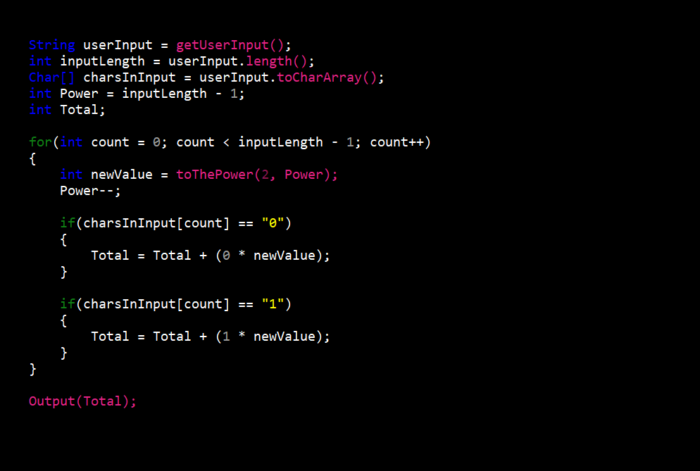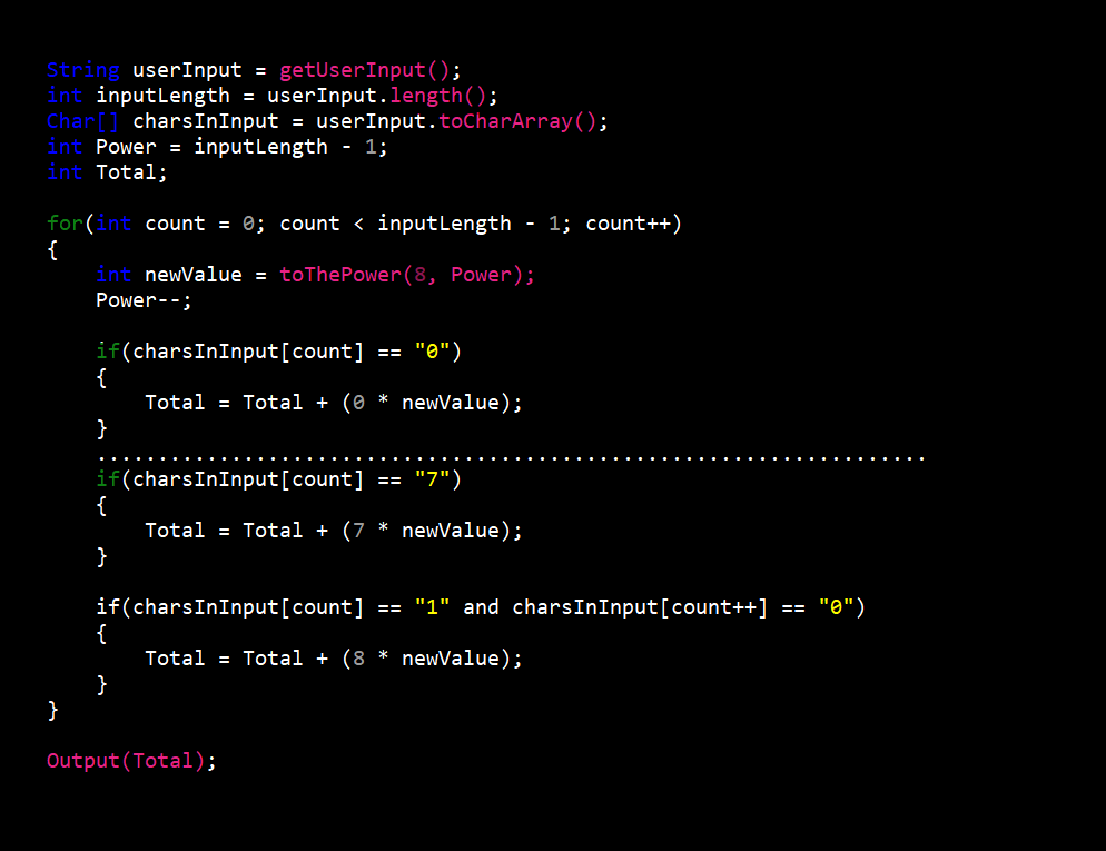 The procedure begins like the octal to decimal converter with getting the users input and as always when converting to decimal it is stored in a character array. Now if the input is more than one (1) character long, we take the first character and convert it to decimal (e.g. 3 equals 3 and f equals 15). We then take that number and multiply it by sixteen (16) to the power of the length of the input minus one (1) to give us a value we’ll call x. If the input were “30” this first step would give us 48 which since the only other character us “0”, x would be the final answer. If any other character is not “0” we would repeat this step and add the new value to x. If the input were “31” the final value would be 31 (3 = 48 and 1 = 1).