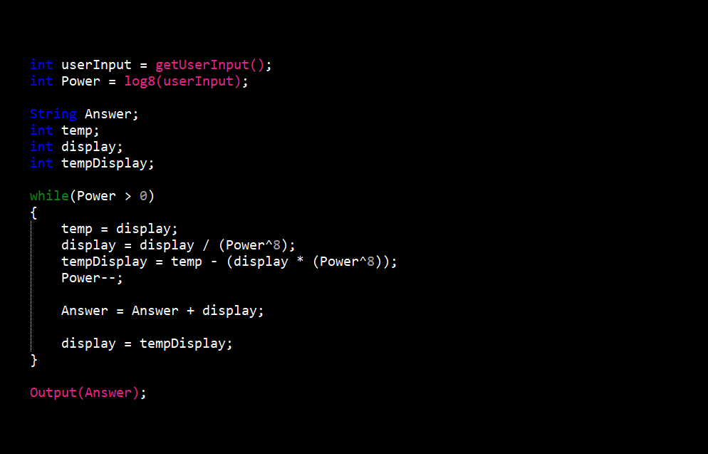 The hexadecimal to decimal converter was the most difficult of the six (6). I had to take into account fifteen (15) different character options when converting to decimal. Along with this, procedures also changed depending on the length of hexadecimal value entered.